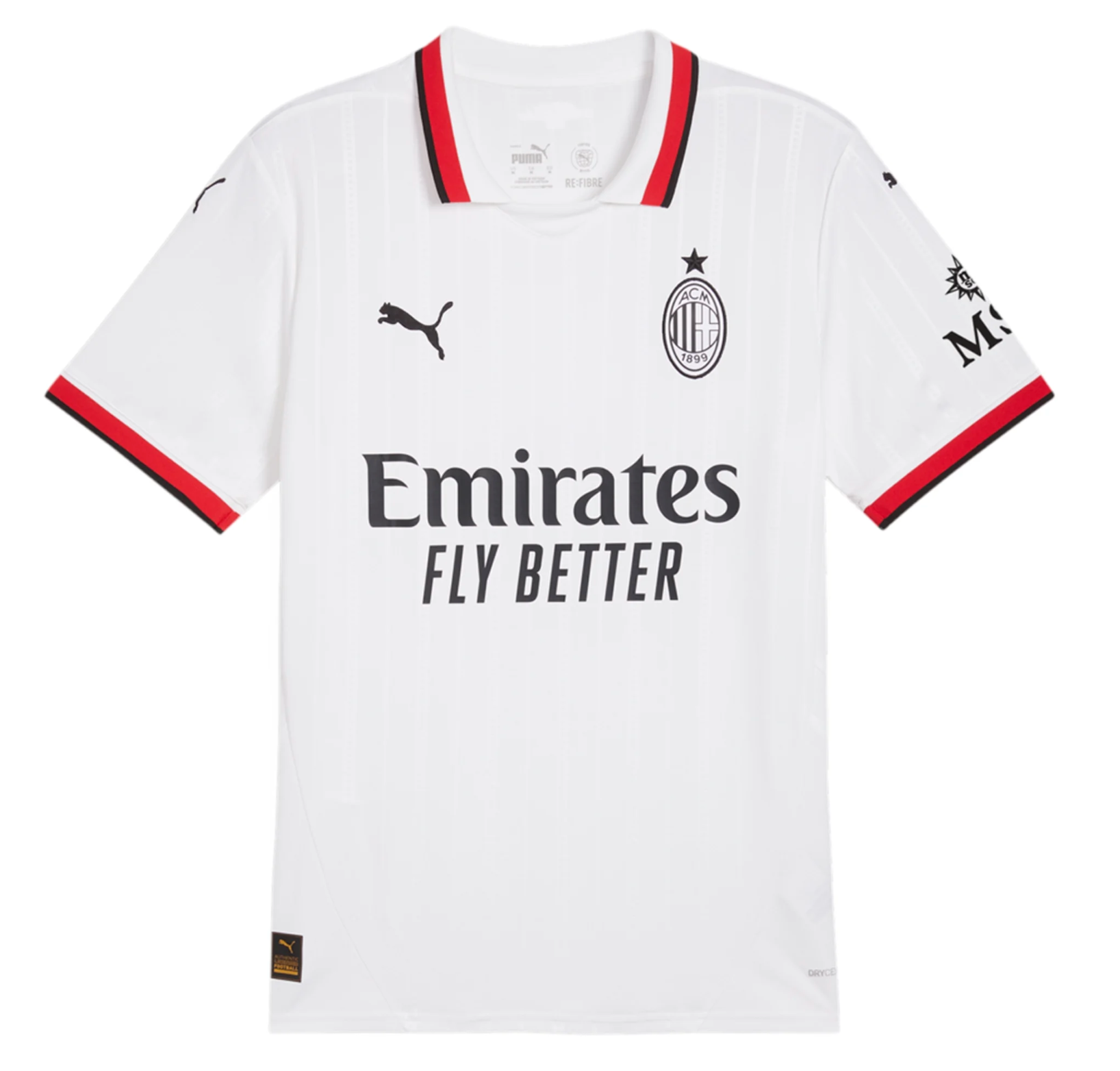 The Lucky One is back, as Milan's classic white away top returns in a glorious and classy format, perfect for a triumphant club such as this. The collar adds style and pizzaz, while also using Mmilan's famous red and black. You'll find the two colors again represented on the sleeve cuffs, while applications are monochromatic, featuring all black against the kit's soft white. Perfect.