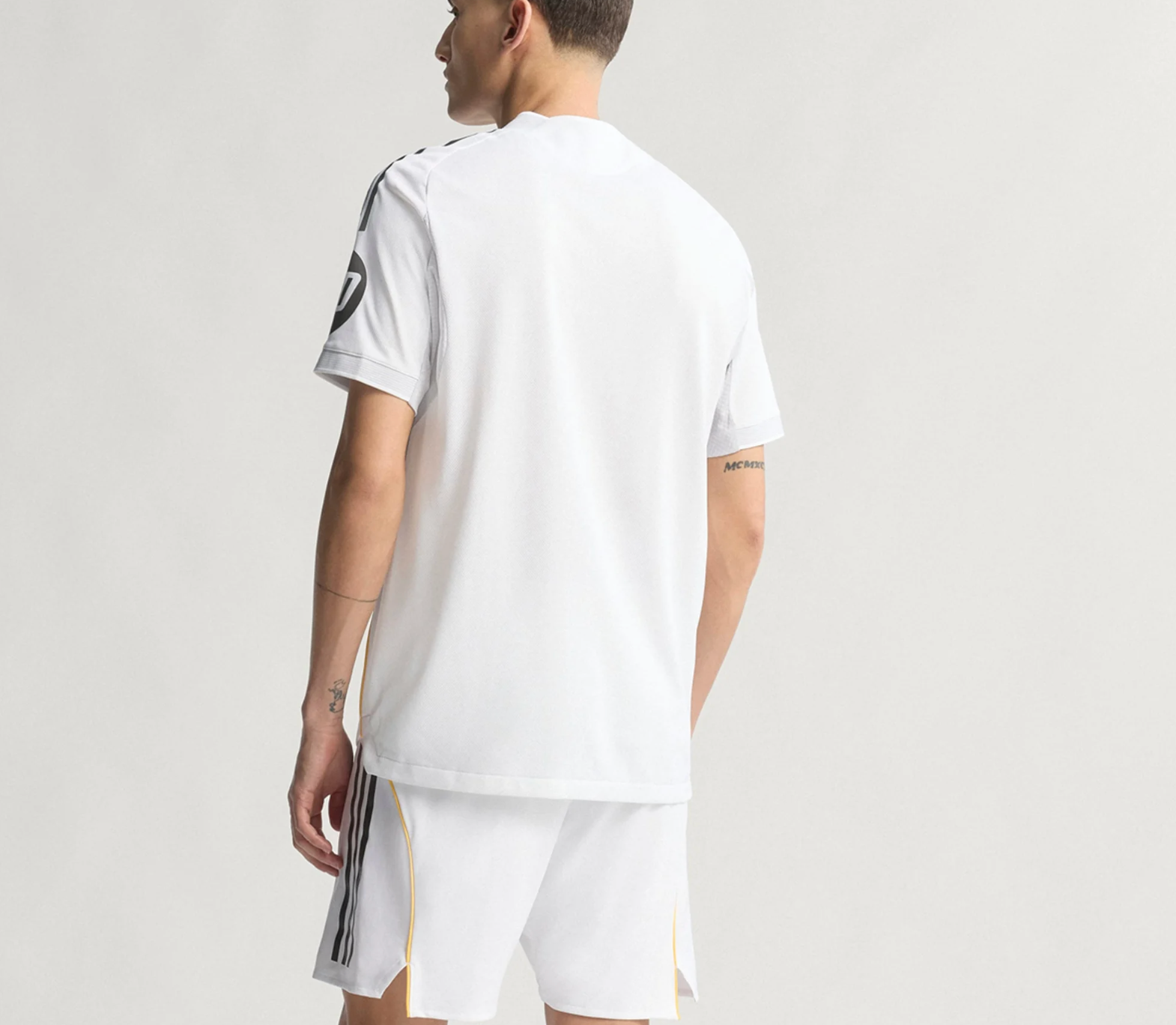 A story told in three parts – the Real Madrid jersey range for the 25/26 season is an homage to the Bernabeau, one of the most famous stadiums in all of soccer. On the home jersey, the standard white kit with classic black and yellow accents returns, with a subtle repeating circular pattern across the chest. It’s this pattern that reminiscent of the exterior of the Bernabeu, before its recent renovations – the imagery on the jersey is meant to remind fans of the circular exterior staircases and the cylindrical columns laced along the stadium’s edges. There’s no place like home, after all.